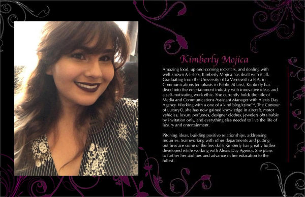 Amazing food , up-and-coming rockstars , and dealing with well known A-listers , Kimberly Mojica has dealt with it all . Graduating from the University of La Vernewith a B . A . in Communications ( emphasis in Public Affairs ), Kimberly has dived into the entertainment industry with innovative ideas and a self-motivating work ethic . She currently holds the title of Media and Communications Assistant Manager with Alexis Day Agency . Working with a one of a kind blogAzine™ , The Contour of Luxury ©, she has now gained knowledge in aircraft , motor vehicles , luxury perfumes , designer clothes , jewelers obtainable by invitation only , and everything else needed to live the life of luxury and entertainment .