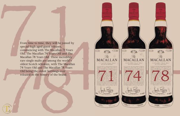 From time to time , they will be joined by special high aged guest releases , commencing with The Macallan 71 Years Old , The Macallan 74 Years Old and The Macallan 78 Years Old . These incredibly rare single malts are among the world ’ s oldest Scotch whiskies , with The Macallan 74 Years Old and The Macallan 78 Years Old being the oldest bottlings ever released in the history of the brand .