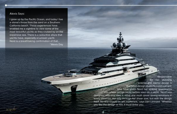 Responsible for her stunning exterior and interior design is the Italian design studio Nuvolari-Lenard , who have given Nord her striking appearance with a bow design never before seen on a yacht . “ Nord was designed with one idea in mind : she must cause strong emotions in every observer , not only through her sheer size , but with the design itself . No one should be left indifferent ,” says Dan Lennard . “ Whether you like the design or not , it must strike you .