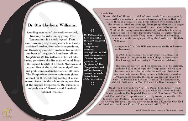 founding member of the world-renowned , Grammy Award-winning group , The Temptations , is a music legend . From award-winning singer , songwriter to critically acclaimed author , from television producer , and Broadway executive producer to executive producer of the group ’ s brand-new album , Temptations 60 , Dr . Williams defied all odds , having gone from the dirt roads of rural Texas to the highest heights of Detroit , Motown , and beyond . One of the world ’ s most significant and prolific musical institutions of all time , The Temptations are entertainment giants revered for their enduring catalog of music masterpieces . As the sole surviving member of the original Temptations , Dr . Williams is uniquely one of Detroit ’ s and America ’ s national treasures .