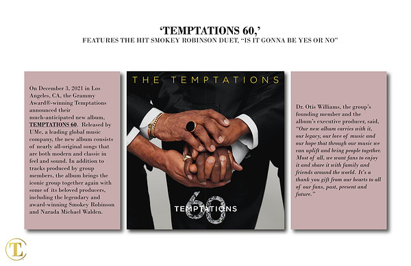 On December 3 , 2021 in Los Angeles , CA , the Grammy Award ® -winning Temptations announced their much-anticipated new album , TEMPTATIONS 60 . Released by UMe , a leading global music company , the new album consists of nearly all-original songs that are both modern and classic in feel and sound . In addition to tracks produced by group members , the album brings the iconic group together again with some of its beloved producers , including the legendary and award-winning Smokey Robinson and Narada Michael Walden .