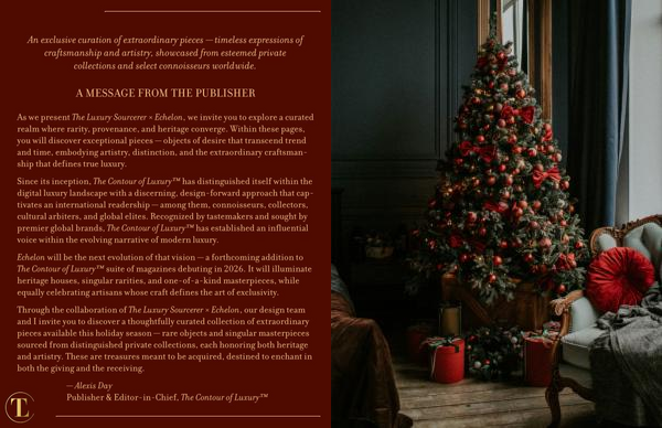 As we present The Luxury Sourcerer × Echelon, we invite you to explore a curated realm where rarity, provenance, and heritage converge. Within these pages, you will discover exceptional pieces— objects of desire that transcend trend and time, embodying artistry, distinction, and the extraordinary craftsmanship that defines true luxury.