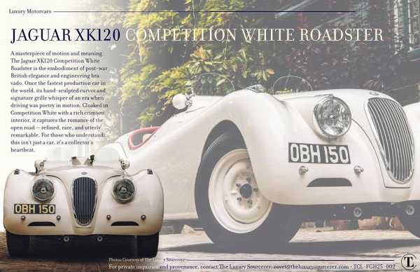 A masterpiece of motion and meaning. The Jaguar XK120 Competition White Roadster is the embodiment of post-war British elegance and engineering bravado. Once the fastest production car in the world, its hand-sculpted curves and signature grille whisper of an era when driving was poetry in motion. Cloaked in Competition White with a rich crimson interior, it captures the romance of the open road— refined, rare, and utterly remarkable. For those who understand: this isn’ t just a car, it’ s a collector’ s heartbeat.