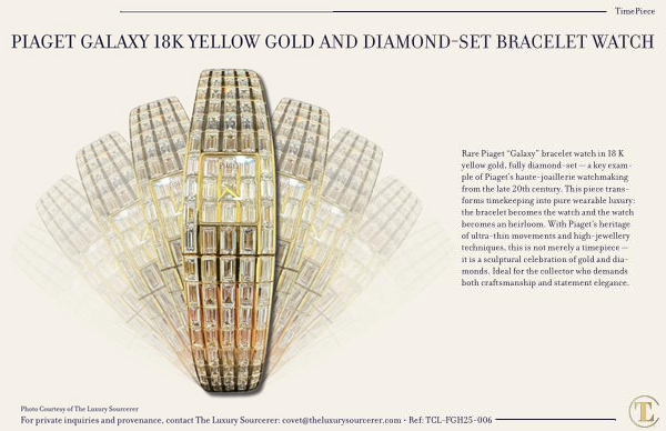 Rare Piaget“ Galaxy” bracelet watch in 18 K yellow gold, fully diamond-set— a key example of Piaget’ s haute-joaillerie watchmaking from the late 20th century. This piece transforms timekeeping into pure wearable luxury: the bracelet becomes the watch and the watch becomes an heirloom. With Piaget’ s heritage of ultra-thin movements and high-jewellery techniques, this is not merely a timepiece— it is a sculptural celebration of gold and diamonds. Ideal for the collector who demands both craftsmanship and statement elegance.