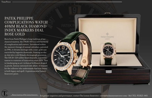 Born from Patek Philippe’ s long tradition of mechanical mastery, the 5961R-010 is a rare harmony of complication and couture. Introduced within the maison’ s lineage of annual calendars, patented in 1996, it elevates heritage with a rose-gold case encircled by baguette diamonds, framing an ebony dial alive with flyback chronograph precision. The CH 28-520 caliber beats beneath, a quiet testament to centuries of innovation since 1839. This is timekeeping as art: technical brilliance draped in jewels, history entwined with allure. A treasure for the collector who understands that true luxury is both legacy and spell. A quintessential Luxury Sourcerer piece.