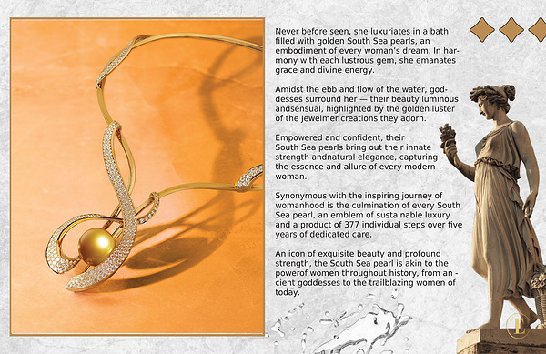 Amidst the ebb and flow of the water , goddesses surround her — their beauty luminous andsensual , highlighted by the golden luster of the Jewelmer creations they adorn .