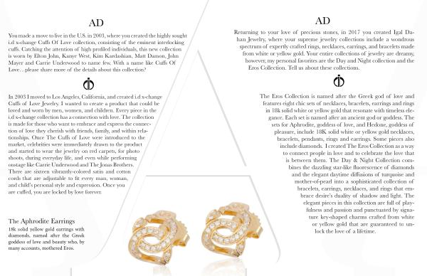 Returning to your love of precious stones , in 2017 you created Igal Dahan Jewelry , where your supreme jewelry collections include a wondrous spectrum of expertly crafted rings , necklaces , earrings , and bracelets made from white or yellow gold . Your entire collections of jewelry are dreamy , however , my personal favorites are the Day and Night collection and the Eros Collection . Tell us about these collections .